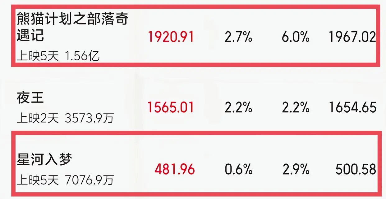 《熊猫缠绵之部落奇遇记》要比《银河入梦》争脸一些,单日票房和排片占比都比新上映的《夜王》要强。