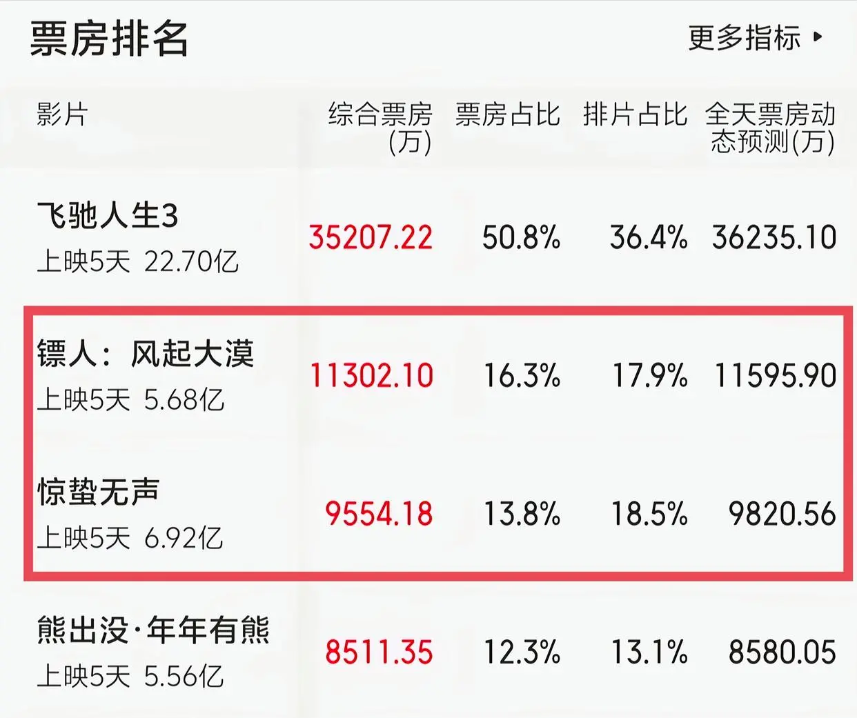 现在,《镖东谈主》排片占比仍是进步至17.9%,虽然比张艺谋合手导,易烊千玺主演的《惊蛰无声》低了0.6%,可是其单日票房却打破到1.13亿,比排在第3的《惊蛰无声》高了快要6000万的单日票房。