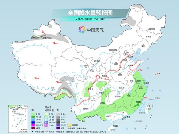 江淮东部、江南大部、西南地区东南部、华南北部和西部、台湾岛东部等地部分地区有小到中雨。