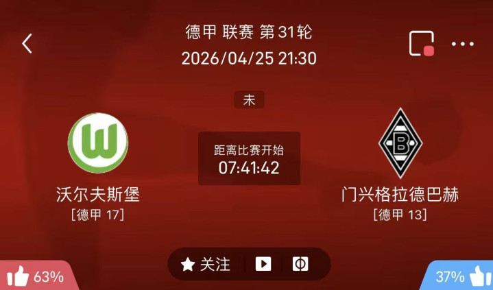 周六012德甲联赛:沃尔夫斯堡VS门兴 比赛时刻:2026-04-25 21:30