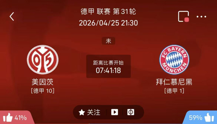 周六013德甲联赛:好意思因茨VS拜仁 比赛时刻:2026-04-25 21:30