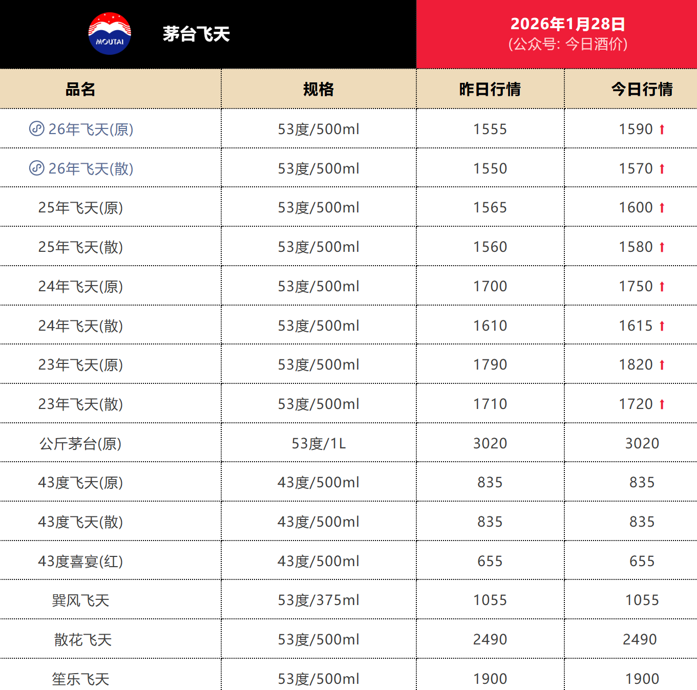 {jz:field.toptypename/}上证报中国证券网讯(记者 高志刚)据酒业数据平台“本日酒价”显露,1月28日,茅台酒全线高涨。其中,25年飞天茅台(原)批发价为1600元/瓶,时时彩app官方最新版下载较前一日涨35元,已较前期低点1495元/瓶高涨约7%;25年飞天茅台(散)价钱报1580元/瓶,较前一日涨20元。