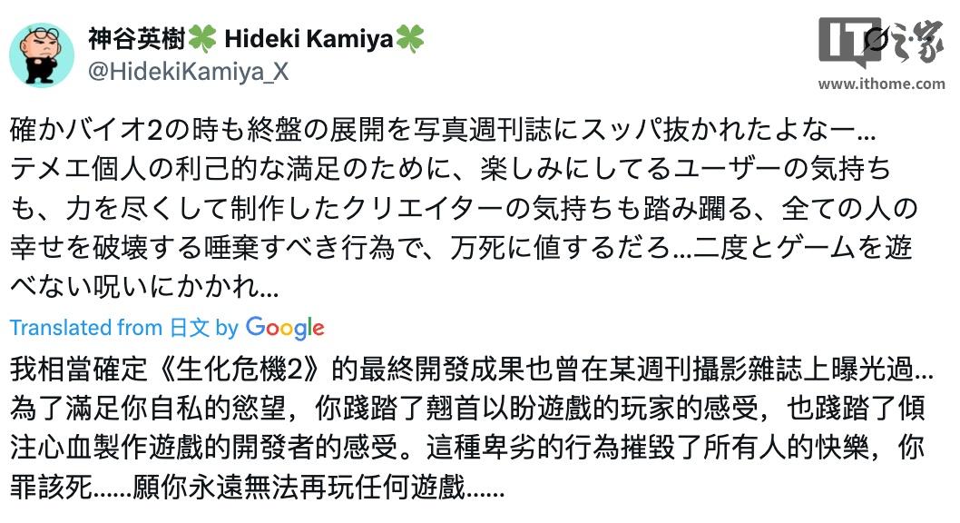 IT之家附神谷英树发文如下: